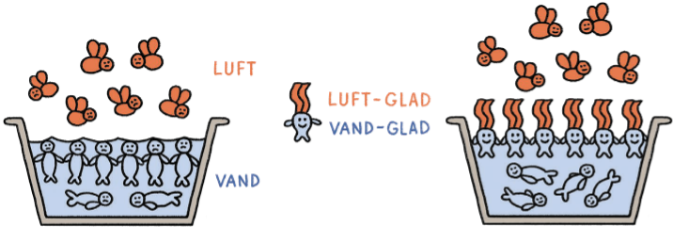 Vand har noget, der kaldes overfladespænding. Det betyder, at der på overfladen sidder en hinde, der prøver at trække sig sammen, så det fylder mindst muligt. Det gør det fordi vandmolekylerne ikke kan lide luftmolekylerne, så vandet trækker sig sammen, så det skal røre luften så lidt som muligt.