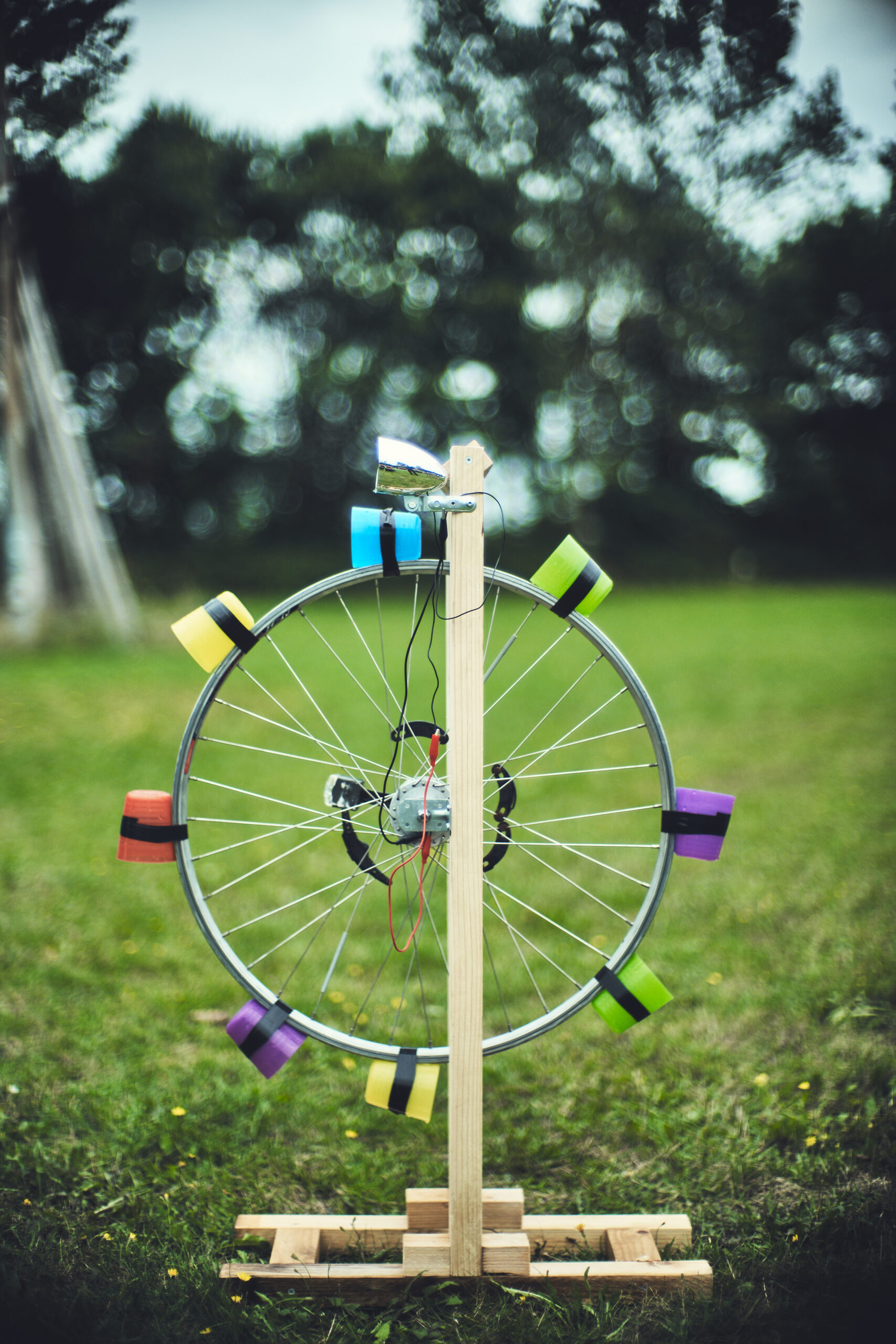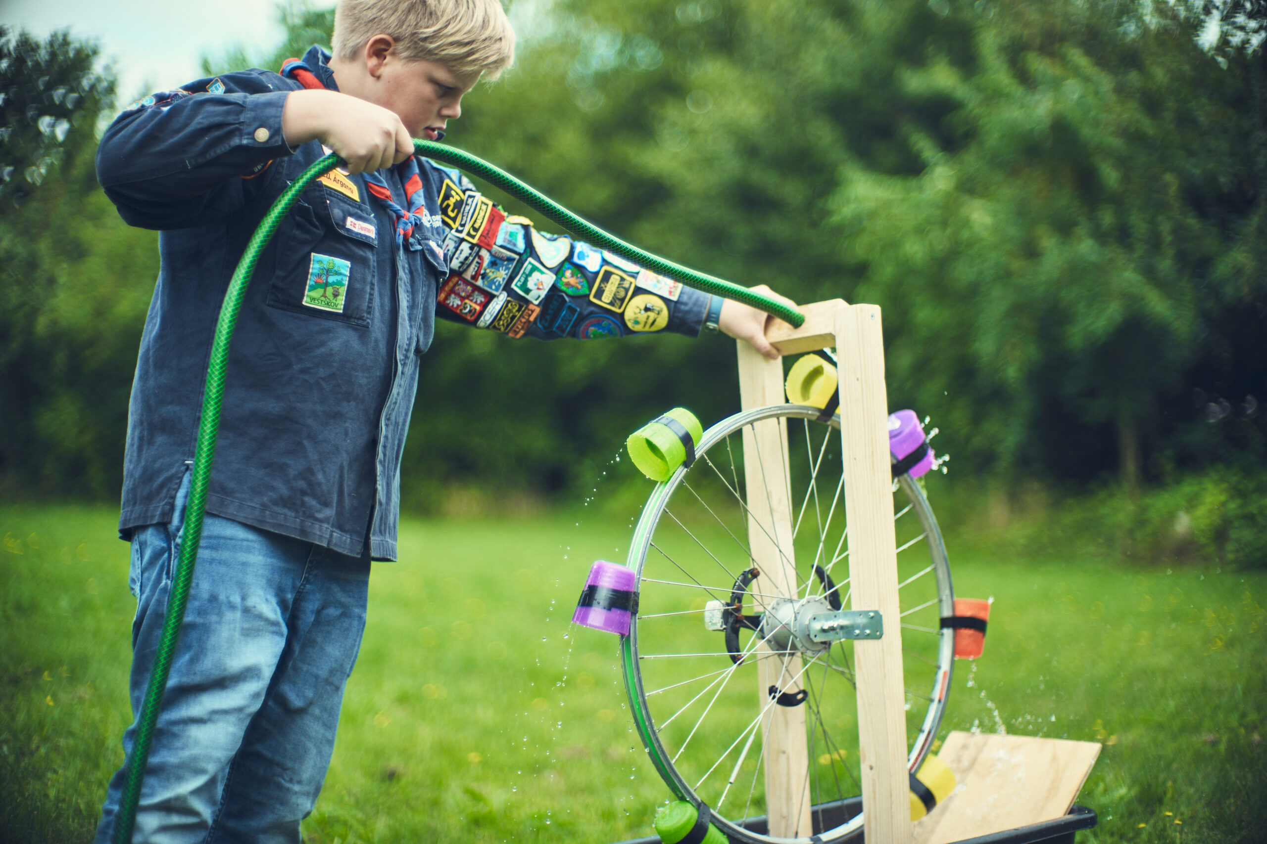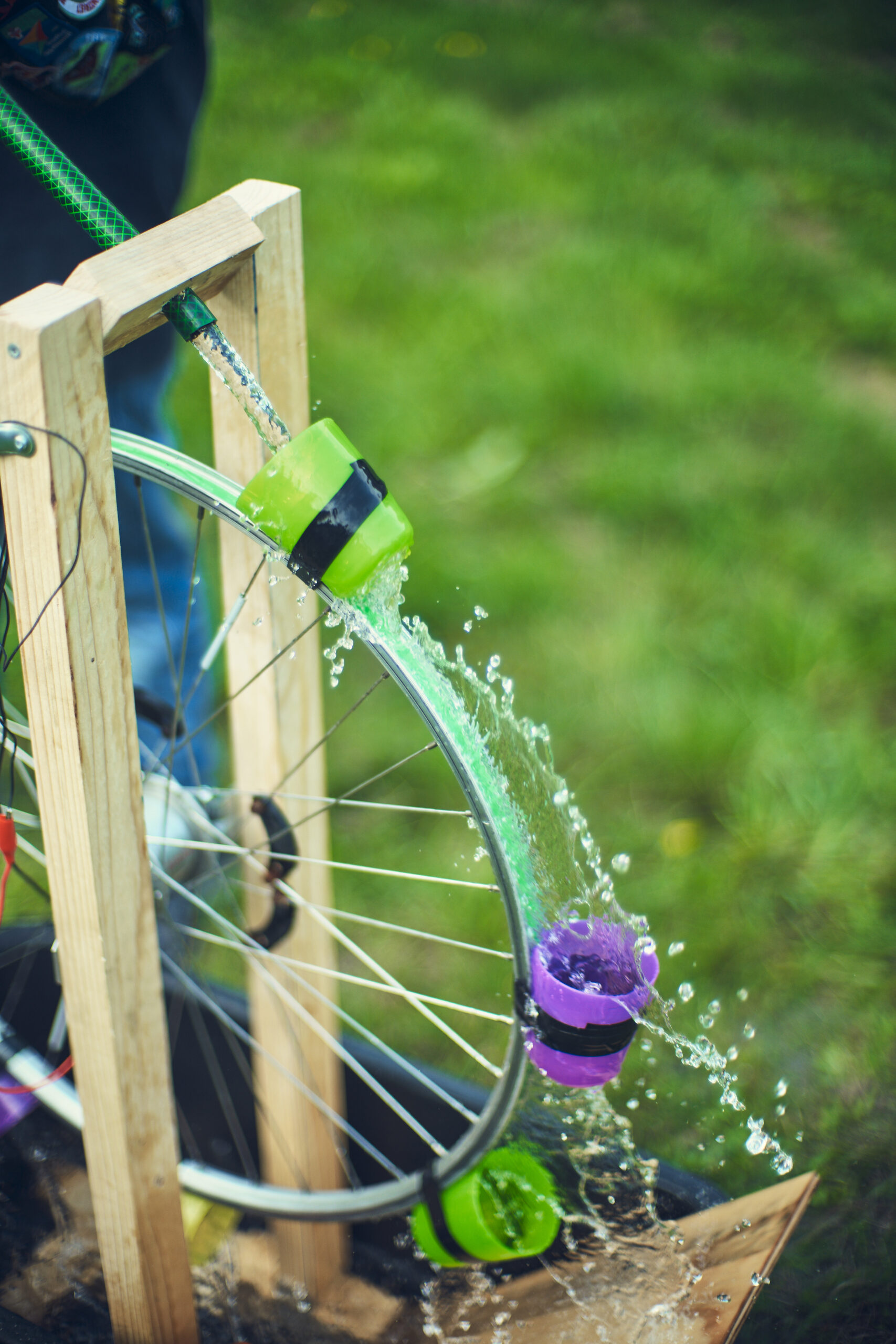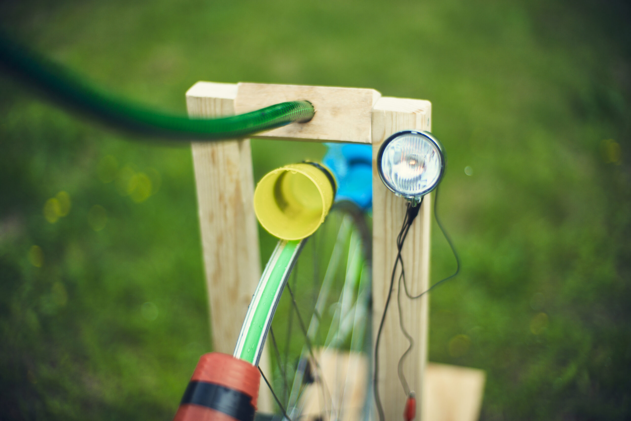 - Byg stativ til at holde cykelhjulet med de 2 vinkler, gerne så højt at det kan holde en vandslange midt over hjulet.