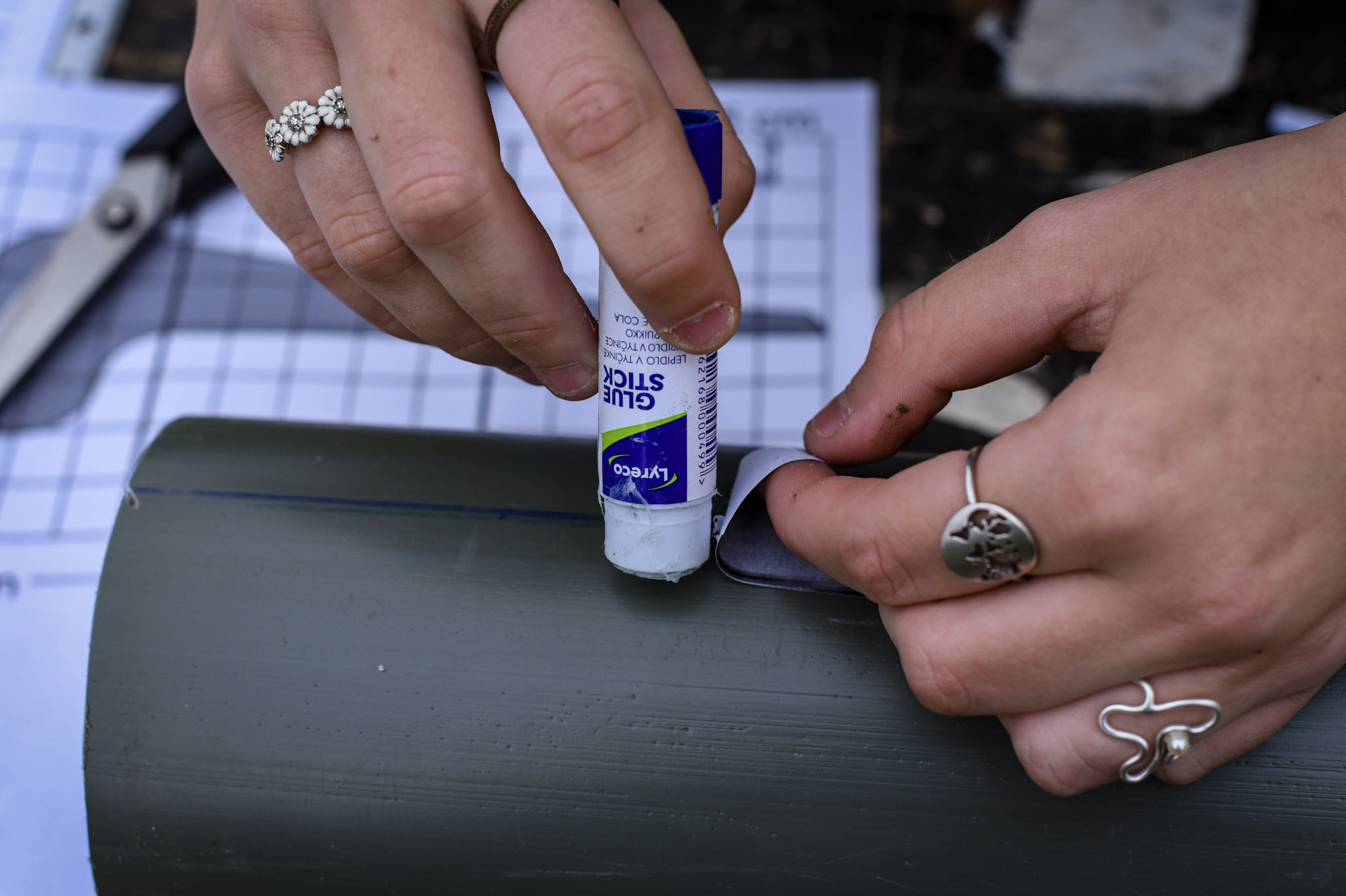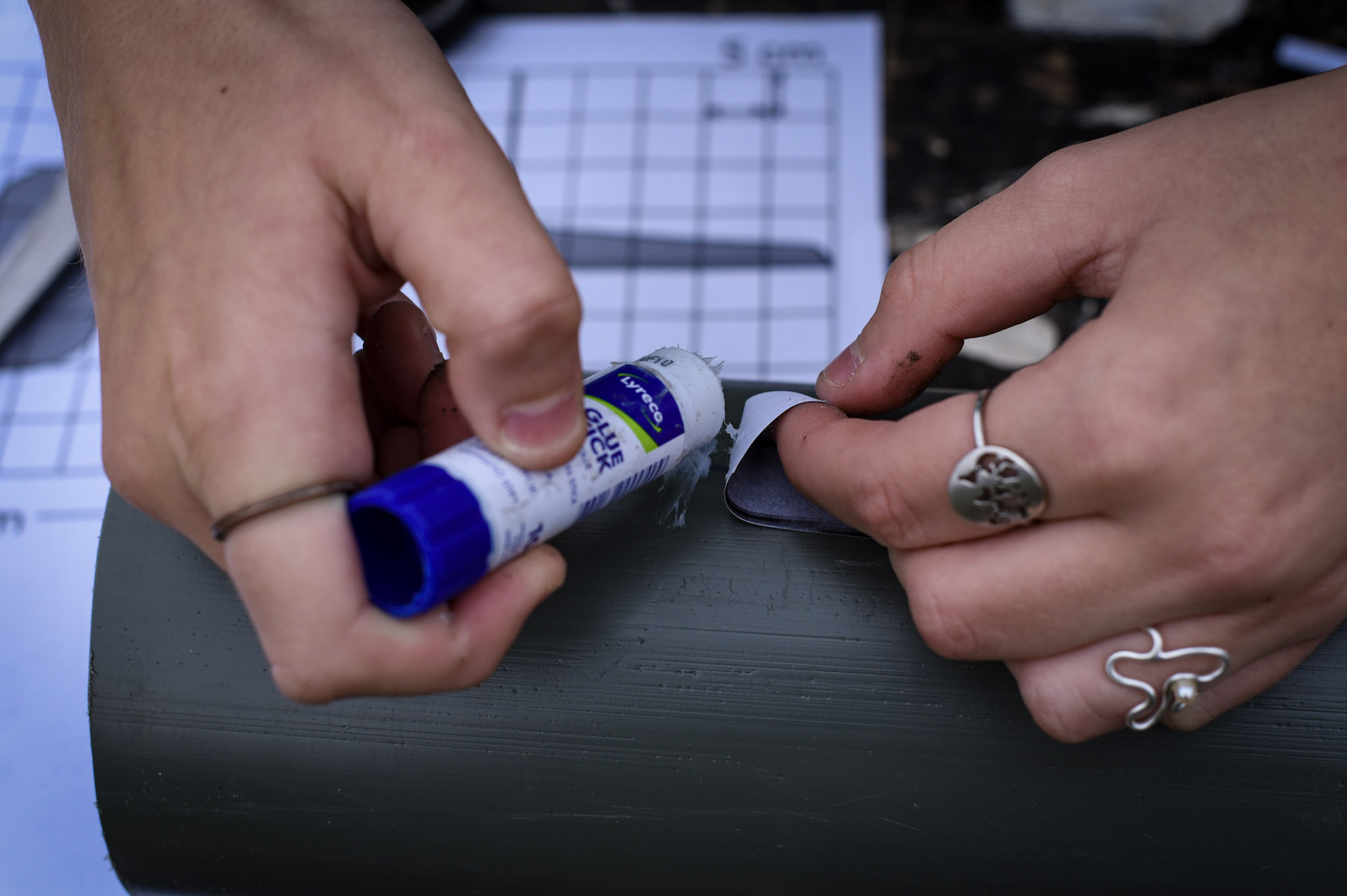 - Monter de 3 stykker af skabelonen på røret med limstiften, så midterstregen på skabelonen følger stregen på røret.