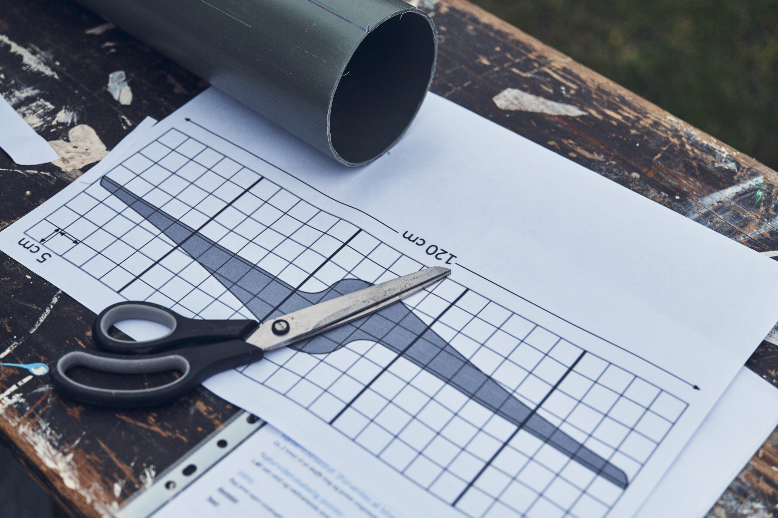 - Print skabelonen til vingen fordelt på 3 stk. A3 papir, så hvert tern er 5 cm, så møllevingen dermed i alt bliver 120 cm. Det passer med, at du printer de 3 sider med en margen på 0,9 cm.